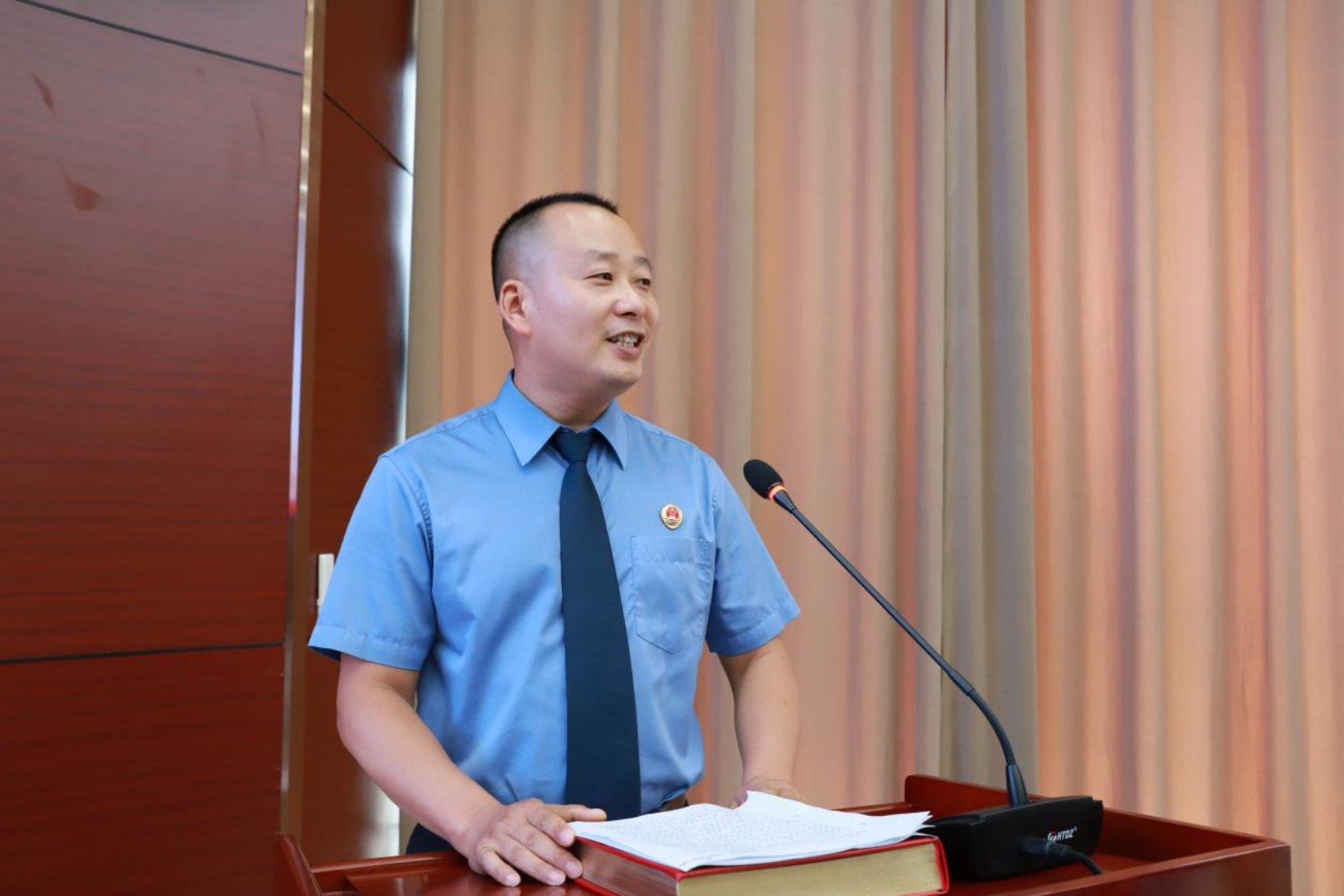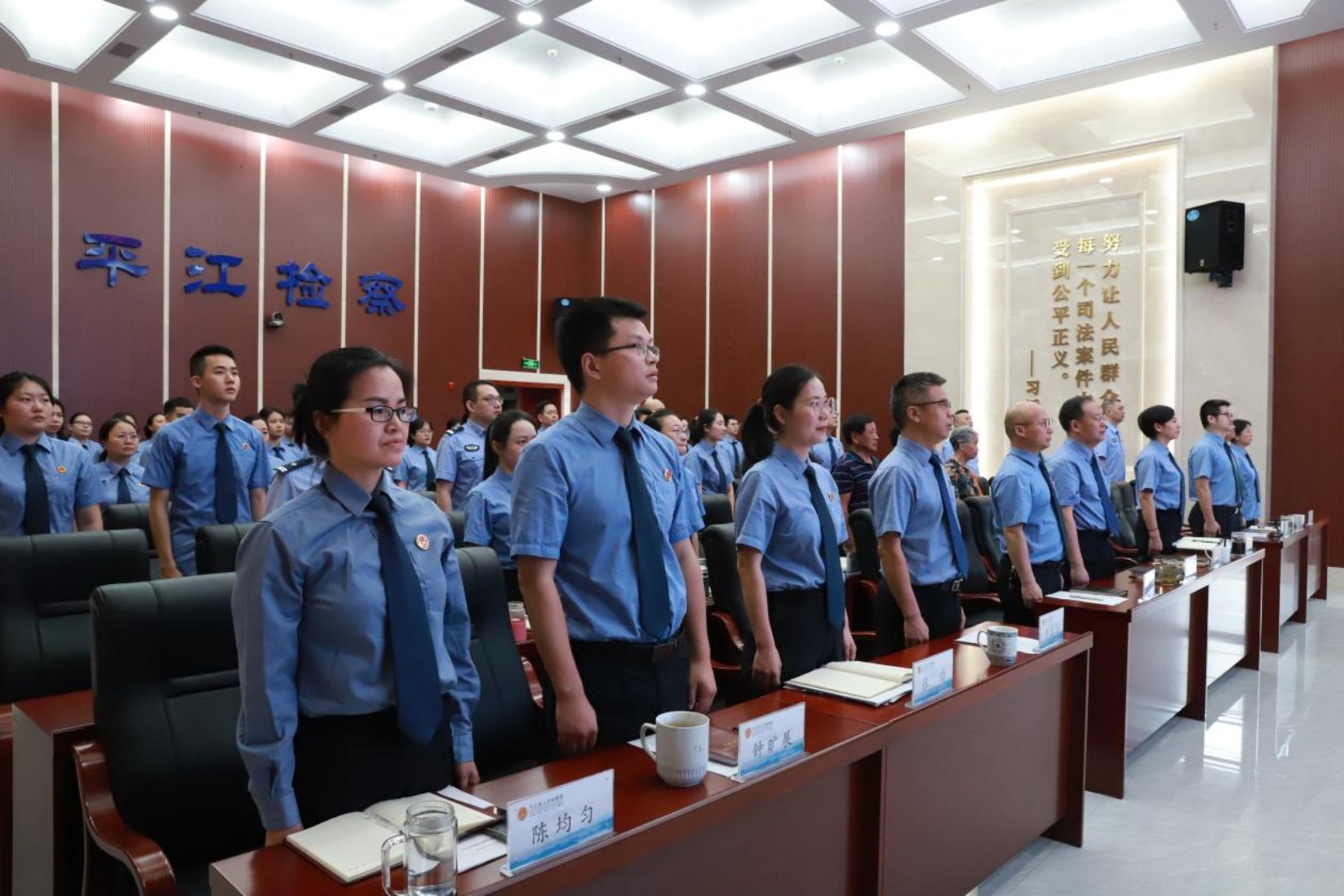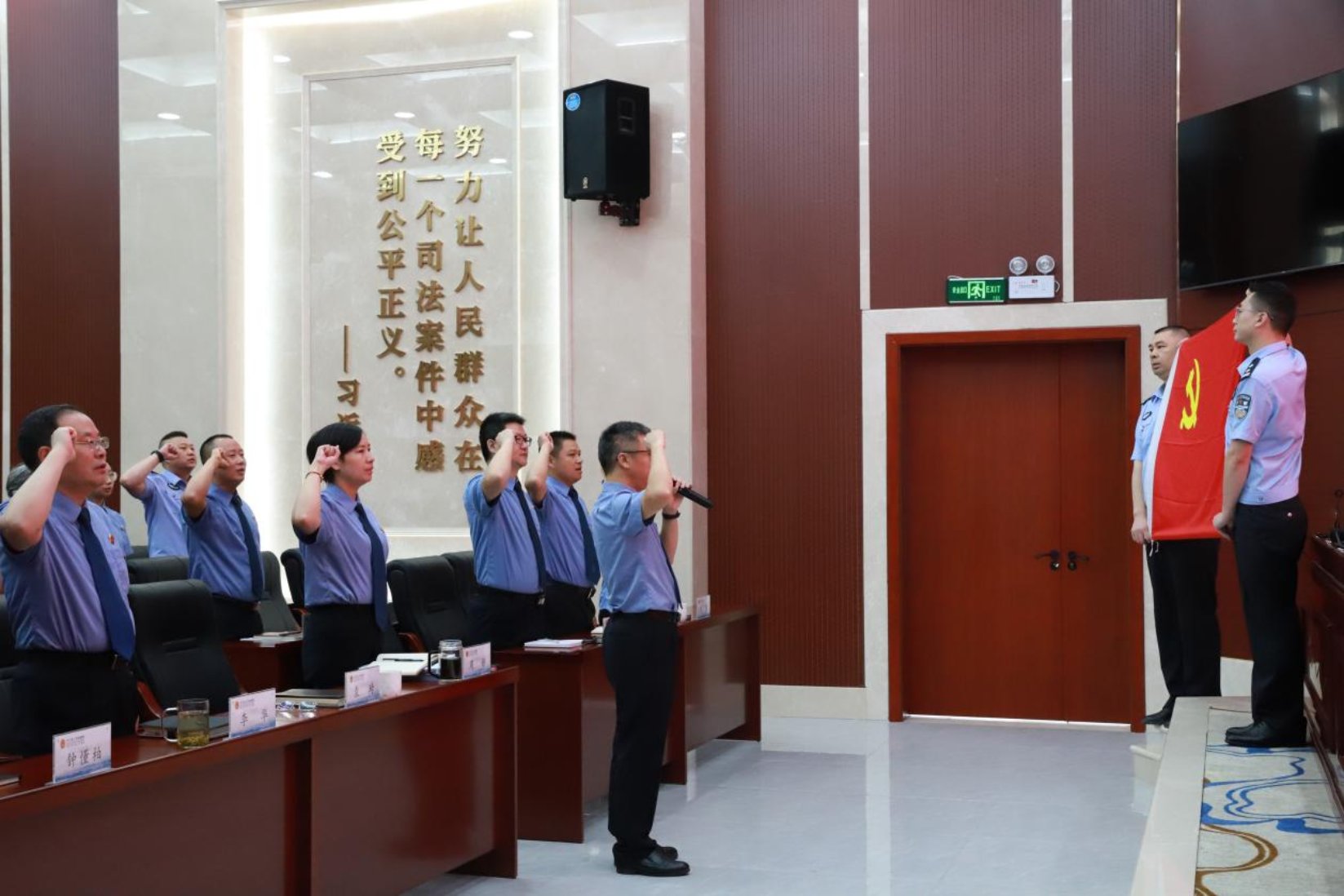大会在雄壮的国歌声中拉开帷幕,全体干警肃立,高唱《中华人民共和国国歌》。