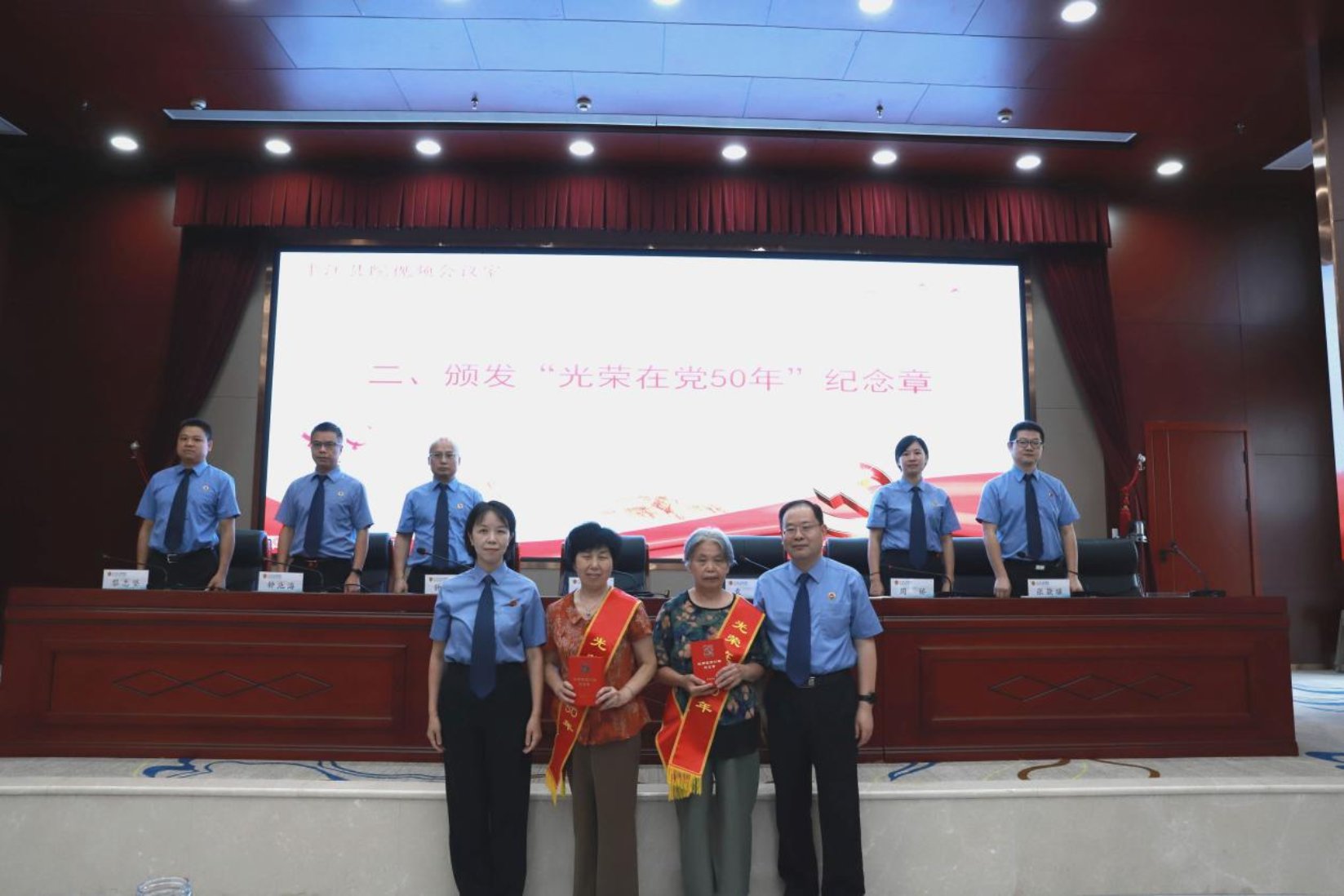 院领导为黄满华、吴灿辉两位老党员颁发了“光荣在党50年”纪念章,并向老党员们表示热烈的祝贺和崇高的敬意。