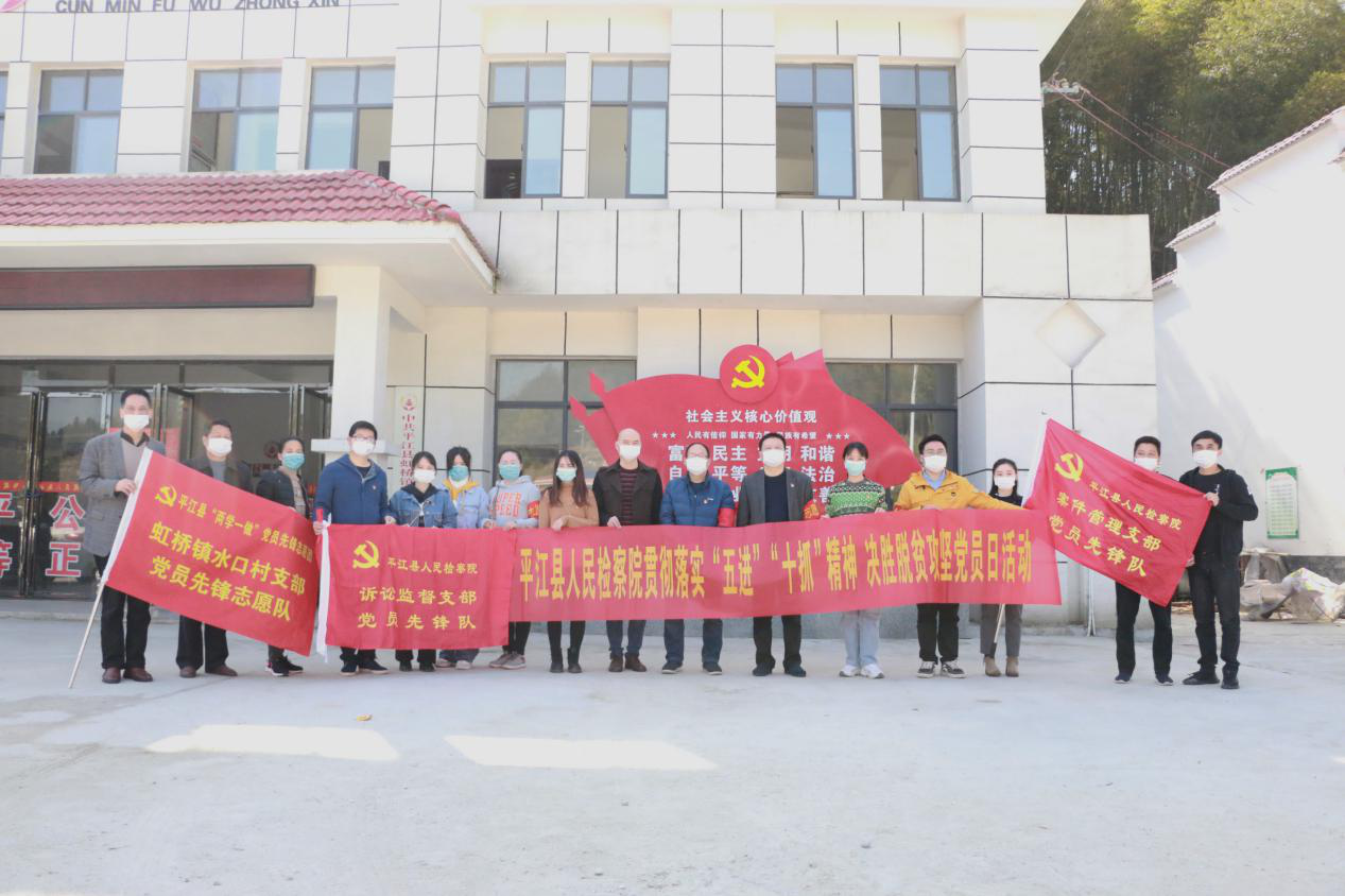 为贯彻落实党员干部下基层、上一线的“五进”“十抓”活动,3月20日,平江县人民检察院党总支组织部分党员干警及书记员前往虹桥镇桃霞水口村开展以“服务基层服务群众”为主题的党员日活动。